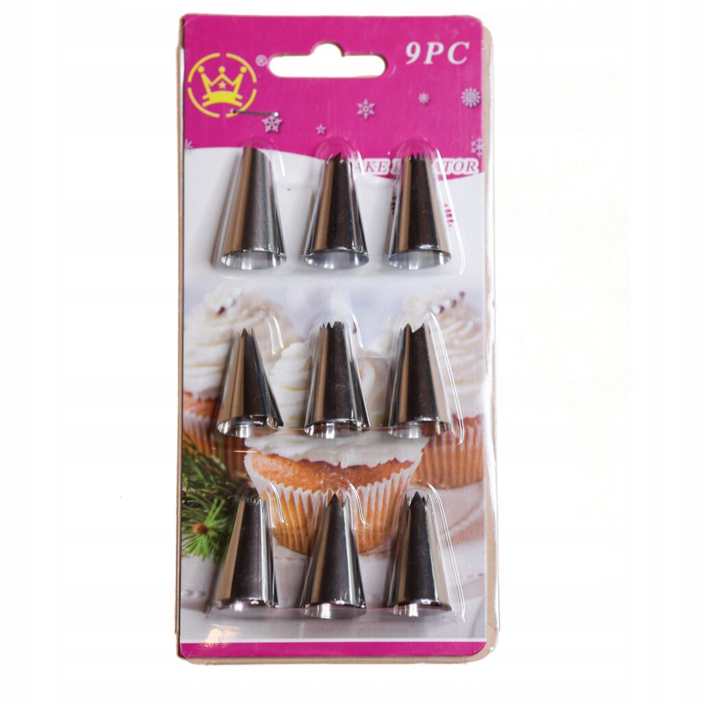 Zestaw składa się z dziewięciu tyłek w różnych kształtach, które mogą być używane w celu wyciskania kremu, bitej śmietany lub innych mas cukierniczych na powierzchnię wypieków. Kształty tyłków mogą obejmować gwiazdki, kwiaty, paski, liście i wiele innych wzorów, które dają możliwość stworzenia różnorodnych dekoracji.
